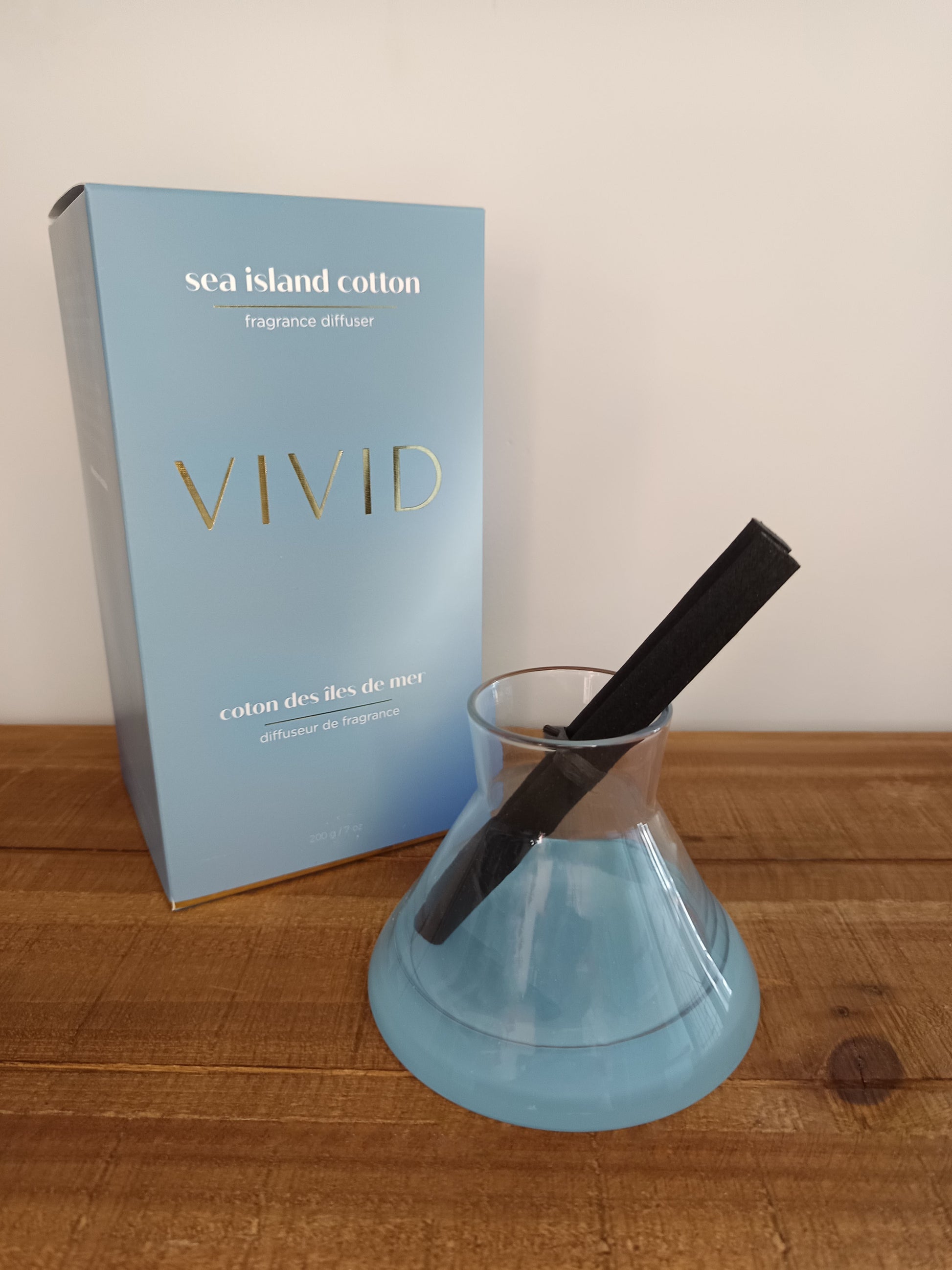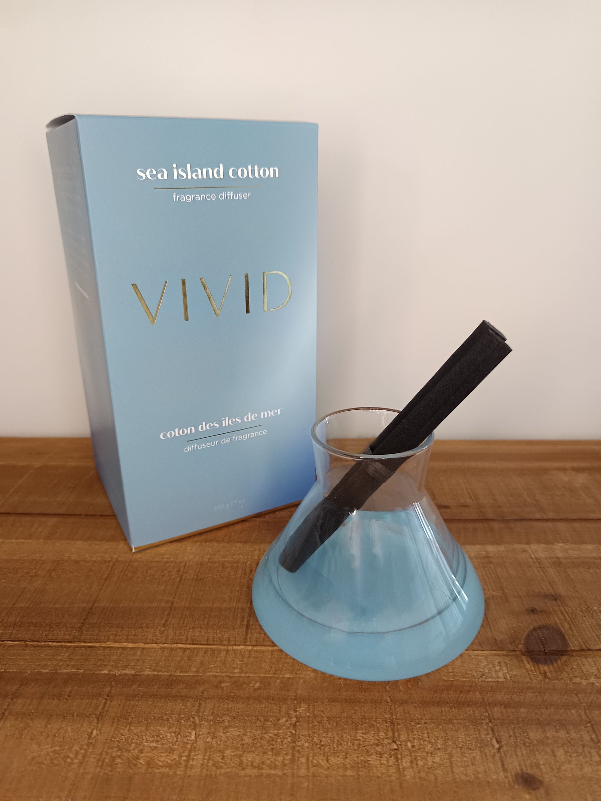 Le diffuseur moderne Coton des îles offre une fragrance fraîche et pure, comme du coton flottant dans une douce brise marine. Fleur de coton et muguet, notes douces de poire verte et de mandarine sur un fond d'océan, de vanille et de musc, avec un zeste de citron. Ce diffuseur moderne diffuse un parfum continu sans flamme pendant 7 semaines. Le flacon en verre bleu contient deux grands bâtonnets noirs et le parfum est conditionné séparément dans un flacon en verre de 200 ml.