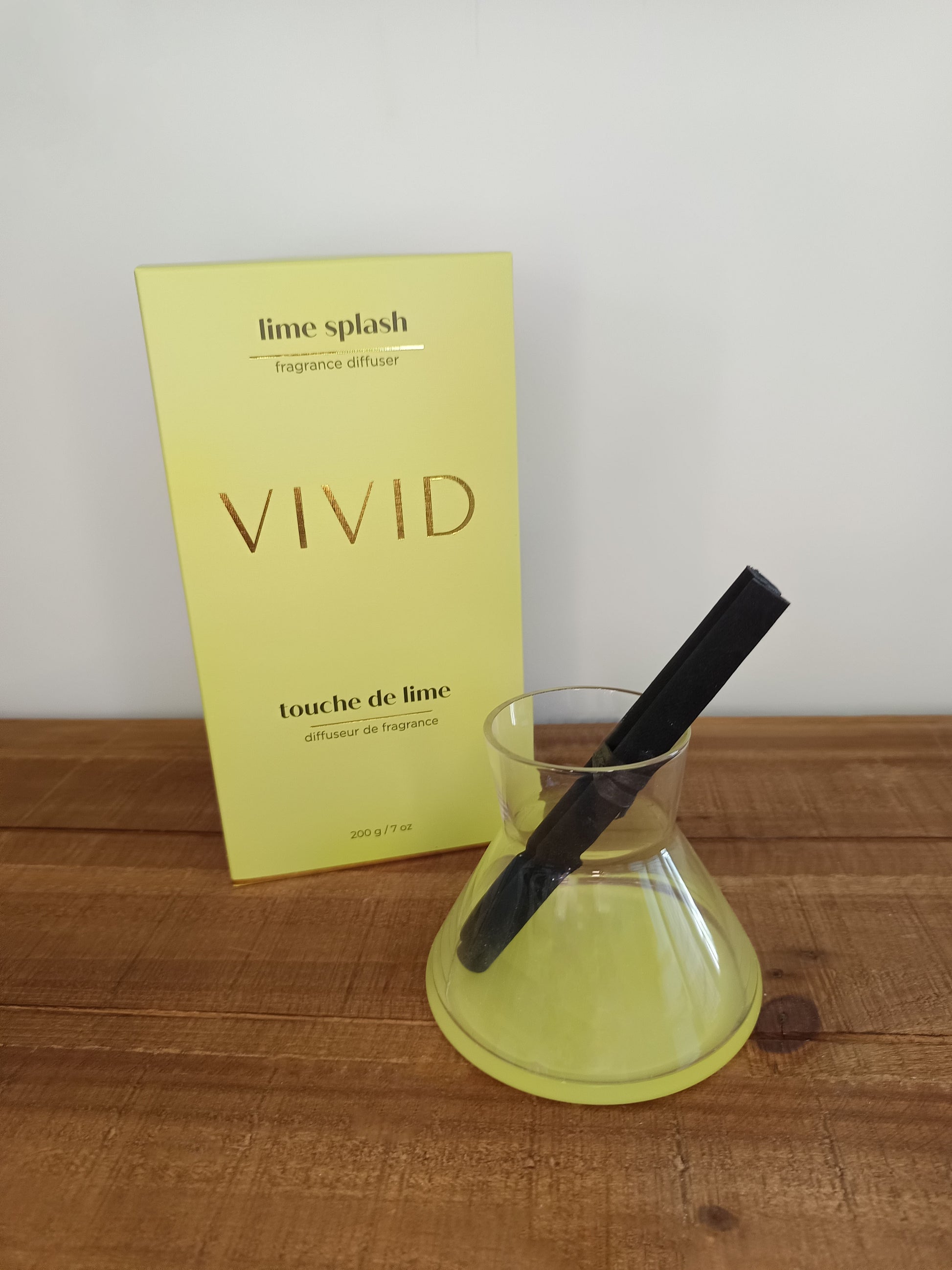 Le diffuseur moderne Lime Splash offre des notes acidulées de citron vert, d'orange et de citron, harmonieusement mêlées à une touche de vanille et de musc. Ce diffuseur diffuse un parfum continu sans flamme pendant 7 semaines. Son flacon en verre vert vif contient deux grands bâtonnets noirs et le parfum est conditionné séparément dans un flacon en verre de 200 ml.